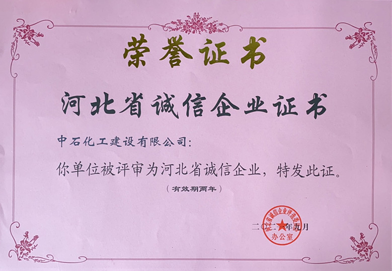 在河北省誠信企業(yè)評選委員會辦公室聯(lián)合河北省企業(yè)家協(xié)會組織的2021年“河北省誠信企業(yè)”評價選樹工作中,公司堅持誠信經(jīng)營,努力提高企業(yè)的誠信建設(shè)水平,積極履行好社會責(zé)任,再次榮獲河北省誠信企業(yè)。